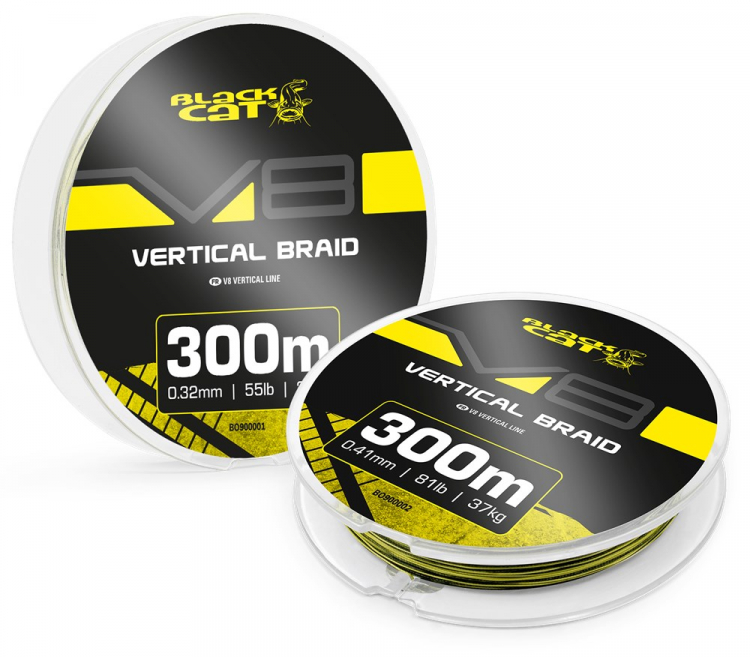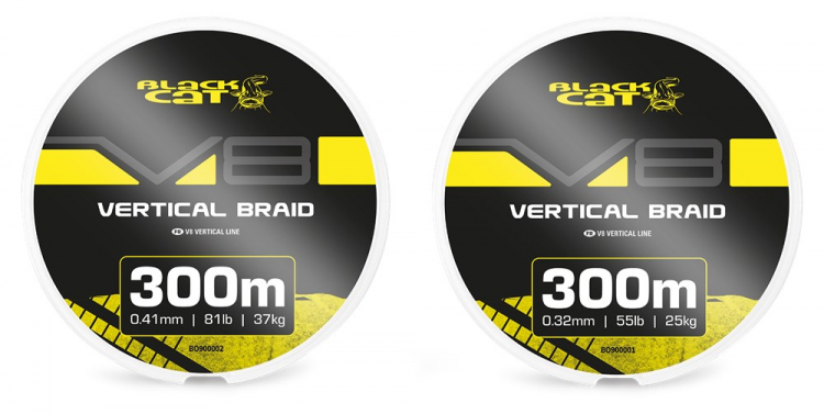 A Black Cat V8-LINE fonott zsinór kifejezetten a vertikális horgászathoz készült, és számos olyan tulajdonsággal rendelkezik, amelyek növelik a horgászat pontosságát és hatékonyságát. 300 m-es tekercsekben kapható, és magas kontrasztú színes szakaszokkal minden méteren a pontos mélységméréshez. A kerek profil csökkenti a vízellenállást és a zajt, míg a 8 szálas, 36 szál/kollon felépítés maximális erőt és sima járást biztosít. A szén-nano bevonat technológia növeli a kopásállóságot. Két átmérőben elérhető: 0,32 mm/25 kg/55 lb és 0,41 mm/37 kg/81 lb.