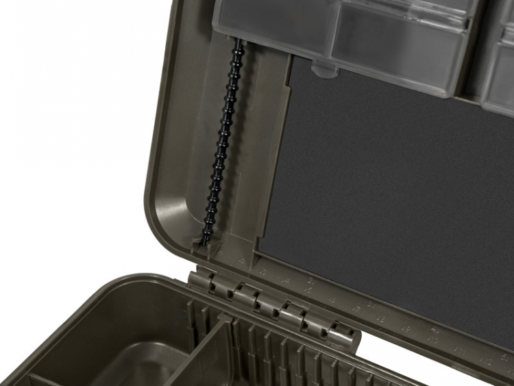 Az alsó rész két rekeszre van osztva. Az első a legnagyobb tárolóhelyet biztosítja, amely ideális csomóhúzó, tűk, olló vagy más kiegészítők elhelyezésére. Ebben a részben egy KlikBOX Rig előkezsinór-tartó is könnyedén elfér (nem tartozék, külön megvásárolható). A második rekesz állítható elválasztókkal van felszerelve, így ennek a belső terét teljes mértékben a saját igényeihez igazíthatja.